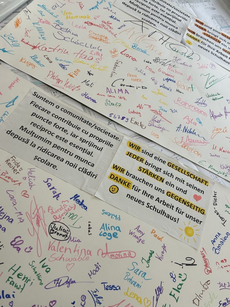 Die Kuchen wurden von SchülerInnen des OHG gebacken und auf den Dankeschön! – Plakaten haben unzählige LehrerInnen und SchülerInnen des OHG unterschrieben. Da die Arbeiter aktuell großteils rumänischsprachig sind, haben wir den Text auch auf Rumänisch gedruckt und hatten einen muttersprachlichen Schüler zum Dolmetschen dabei.